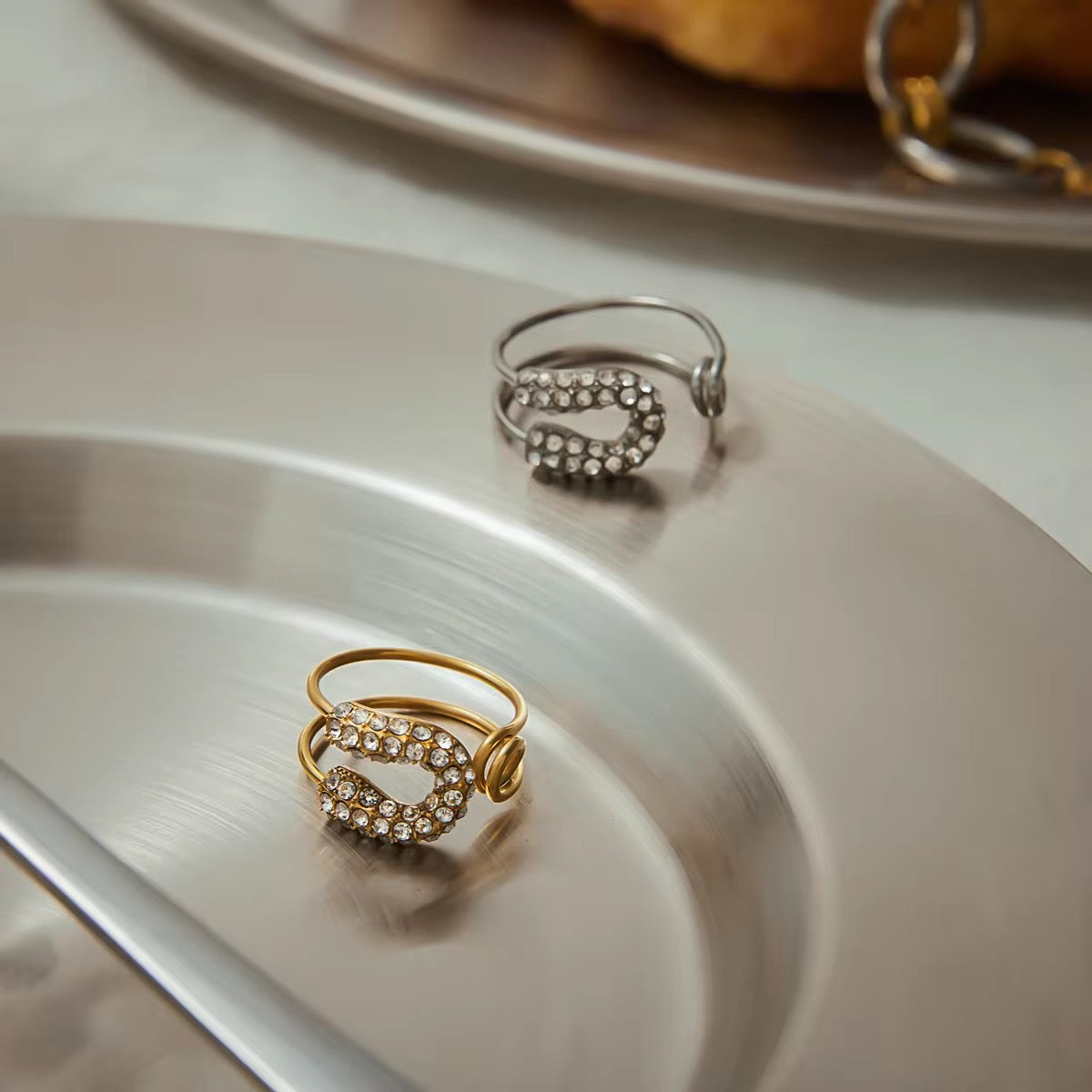 Coco Ring Add a playful twist to your style with the Coco Ring. Designed in a unique safety pin shape, this gold-plated ring is half-studded for just the right hint of sparkle. Adjustable for the perfect fit, it’s chic enough for a day out and bold enough to make a statement in the evening. Wear it solo for an effortlessly cool look or stack it up to show off your style. Material: Stainless steel Plating: 18k gold plated Features: Hypoallergenic, anti-tarnish, water resistant, high polish finish Quality: Long-lasting jewellery, carefully hand-sourced, crafted with the finest quality Pretty, unexpected, and always eye-catching — the Coco Ring brings a touch of luxe edge to any outfit.