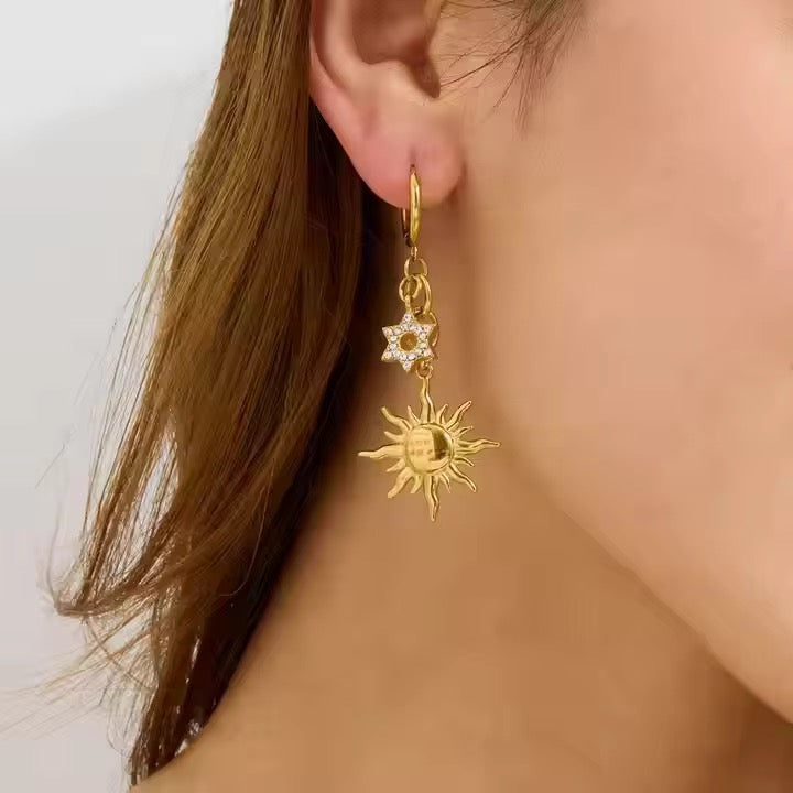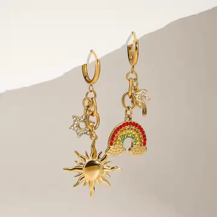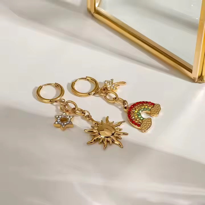 Embrace playful charm and bold style with the Moana Earrings. These unique gold-plated huggie hoops feature an eye-catching mismatched design — one hoop adorned with a rainbow charm, the other with a radiant sun — for a look that’s full of personality and summer spirit. Designed to hug your ears just right, they’re perfect to wear solo for a pretty statement or stacked with your favourite pieces for extra impact. Ideal for bright days out or adding a fun twist to an evening look.